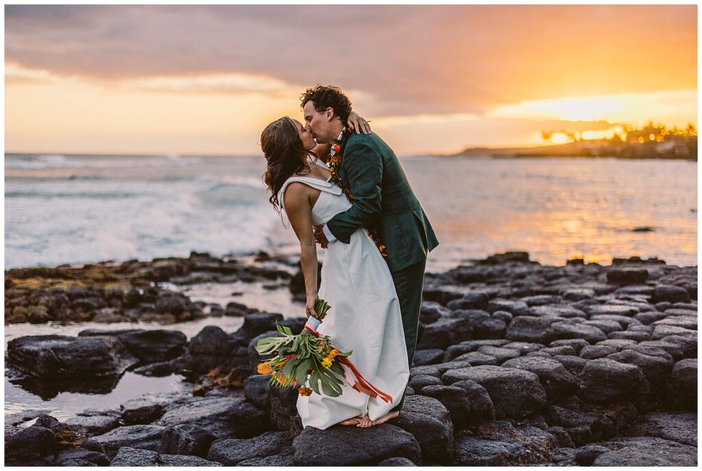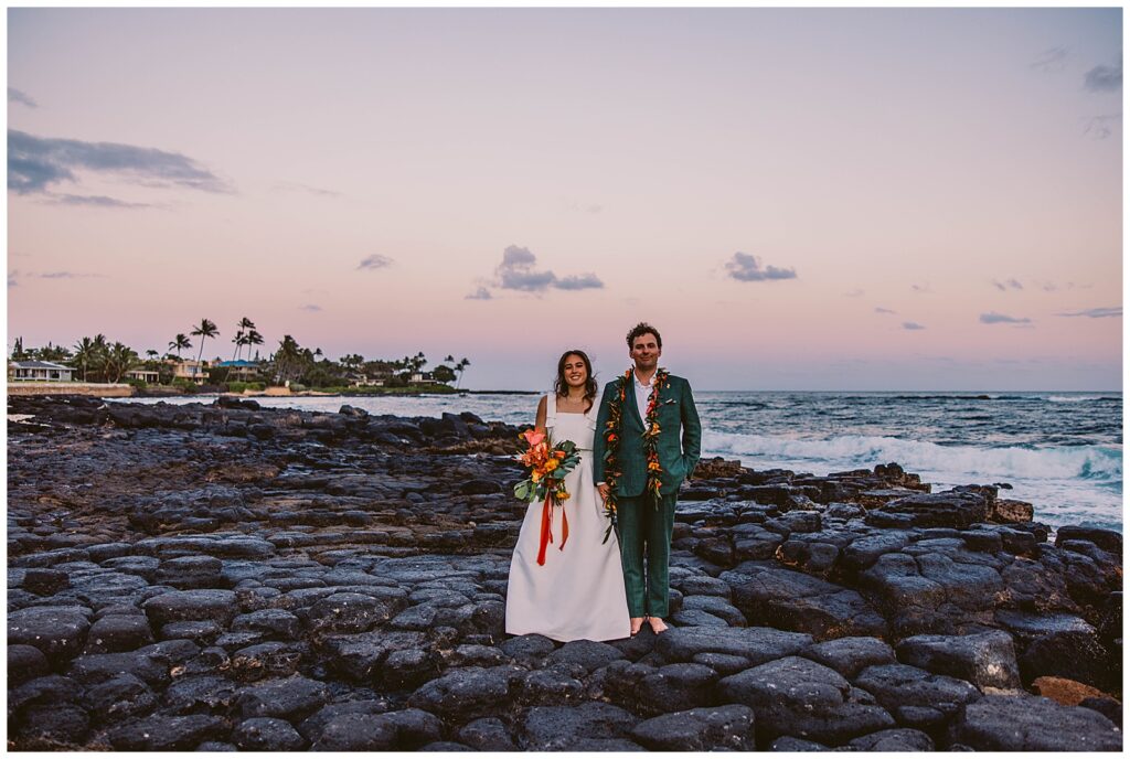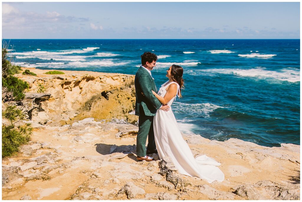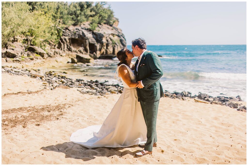 Their first look took place on a nearby beach, an intimate and emotional moment that set the tone for the day. Afterward, they ventured up a dirt trail to the ocean cliffs, where their photographer in Kauai captured stunning portraits framed by the island’s natural beauty.
