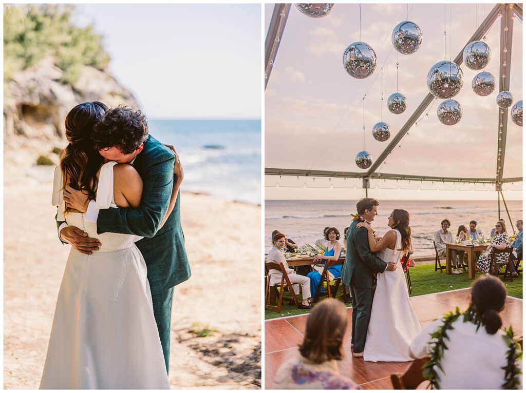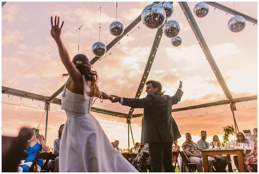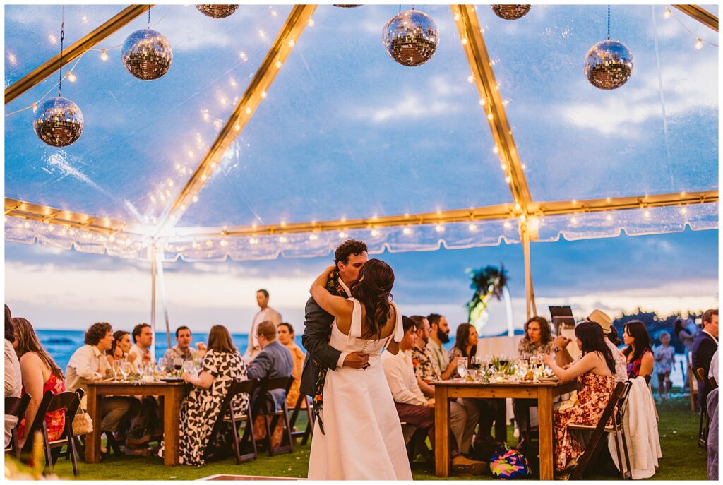 The reception took place under a clear top tent filled with disco balls and twinkle lights, creating a romantic yet lively ambiance. Before the evening festivities began, Micah took the couple down to the ocean’s edge for golden hour portraits that perfectly captured their love and joy.